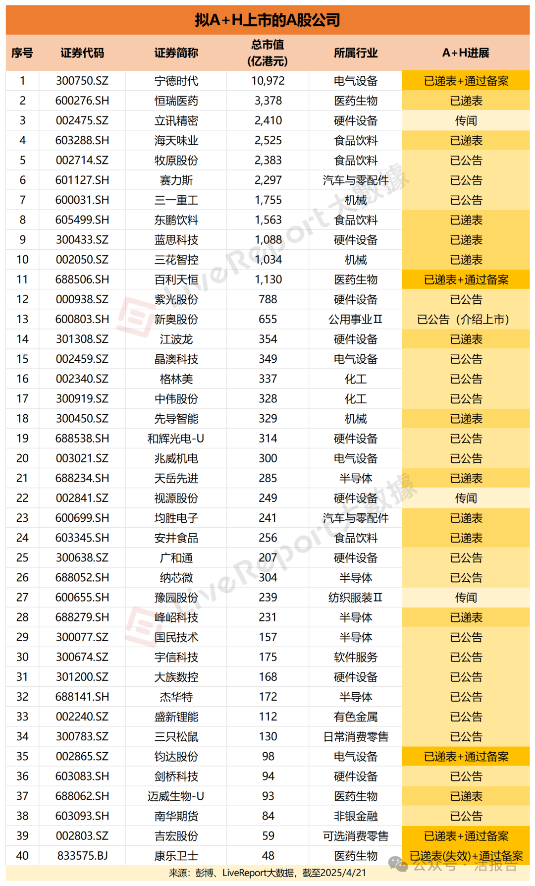 据LiveReport大数据统计,截至4月21日,今年已有赤峰黄金(6693.HK)登陆港交所,共有40家公司拟“A+H”上市,其中17家已递表,20家已发公告。