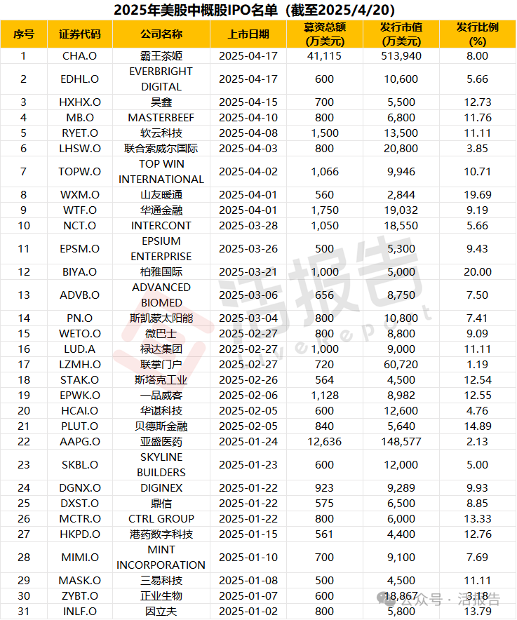 31只中概股中,除1只为美交所上市外,其余登陆地均为纳斯达克市场。全部年内IPO新股的发行市值合计不超过100亿美元,平均募资不足2500万美元,平均发行比例约为8%。其中,只有5只中概股采取了VIE上市架构,占16%。