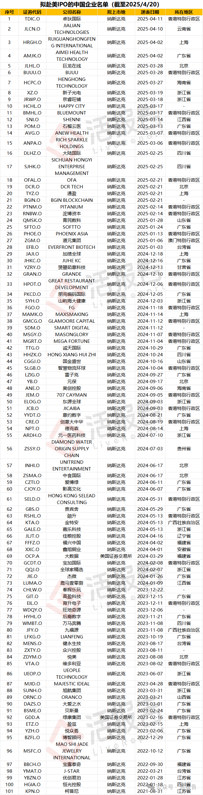 曾申请在美股IPO的中企还有上百家,其中35家注册在香港及海外,其余分布于内地各省市。广东地区拟赴美IPO的企业最多,达27家。2025年以来,新递表、未上市公司有近30家。