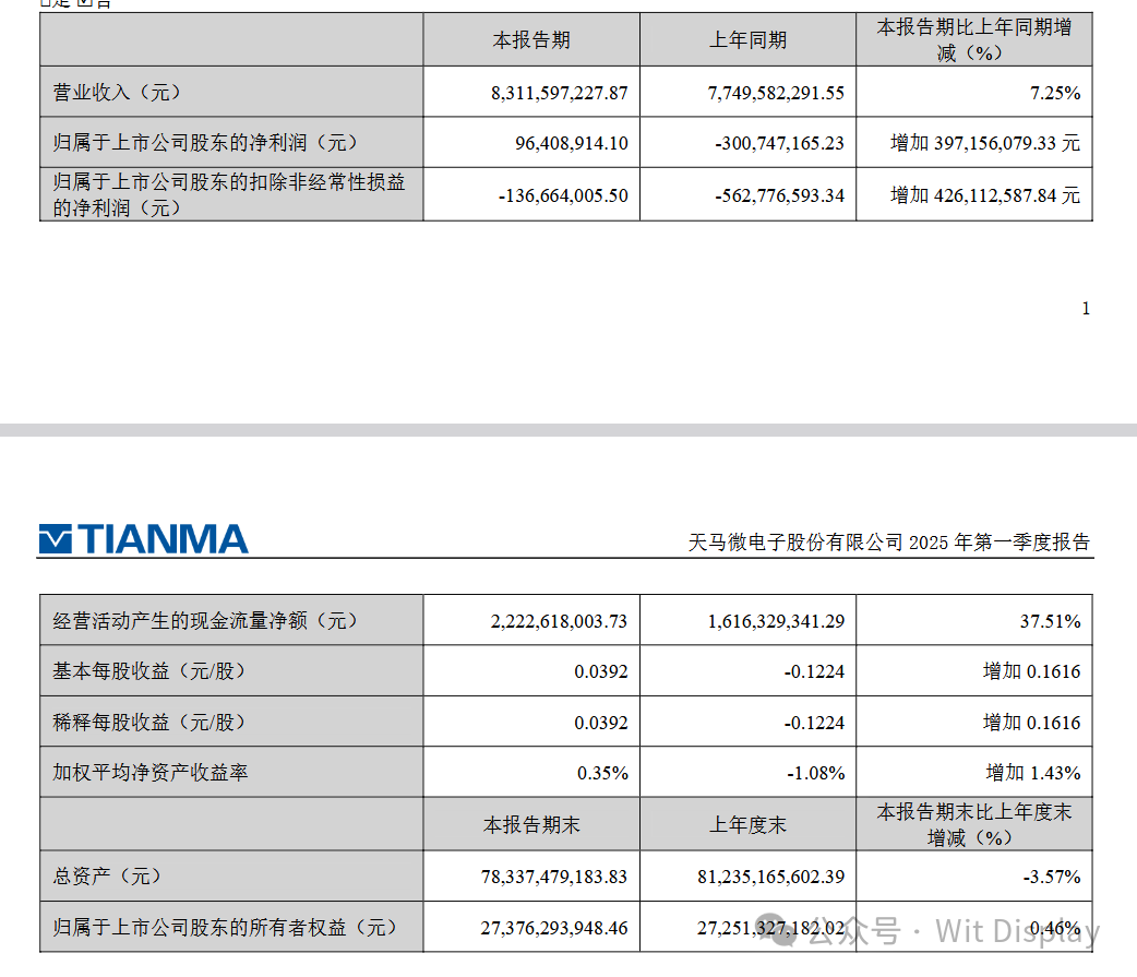 天马微电子股份有限公司发布2025年第一季度报告,实现营业收入83亿元,同比增长7.25%,实现归属于上市公司股东的净利润9641万元,同比改善3.97亿元,实现经营活动现金流量净额22亿元,同比提升37.51%.