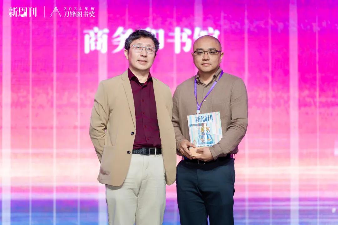 2024刀锋图书奖推委许纪霖(左)为《康熙的红票:全球化中的清朝》作者孙立天颁发荣誉。(图/新周刊)