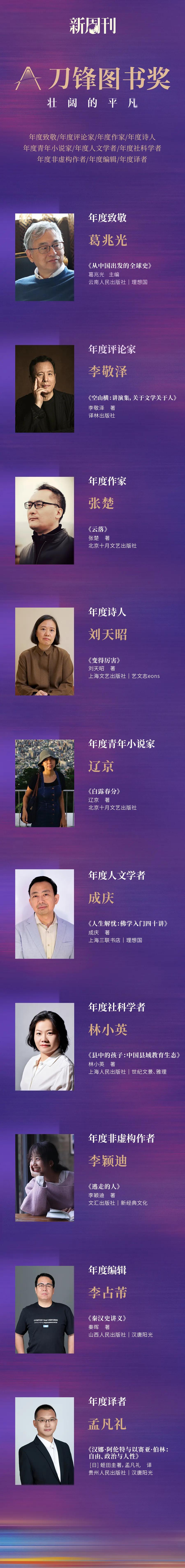 “今年,刀锋图书奖5岁了。从2021年至今,50位专业推委和我们一起,共同评选出近1000本好书;29位作家、学者、出版人获得年度人物奖项荣誉,49部作品获得年度好书荣誉。这5年里,刀锋图书奖始终坚持独立、公正、真诚的姿态。因为我相信,唯有这样的选择,才能经得起当下与未来的凝视。”