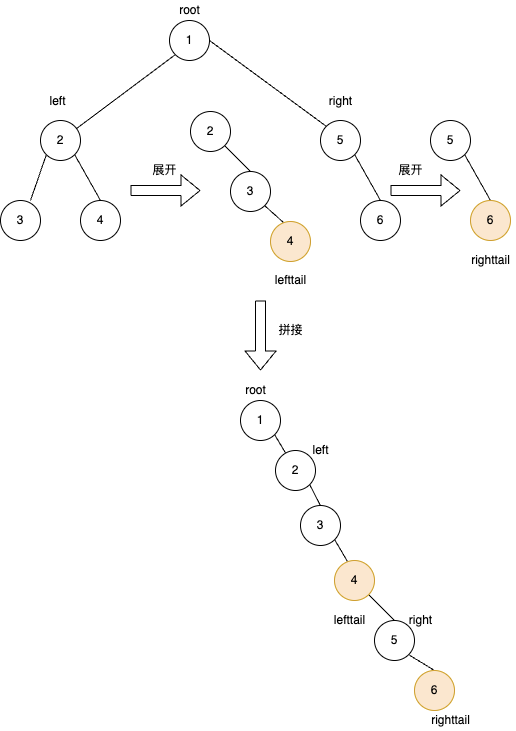 这就需要我们在递归函数中对指定的树展开的同时,并返回展开后的尾部节点,使得拼接操作更方便。