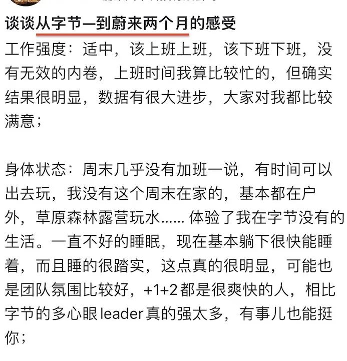 今天看到一位从字节跳到蔚来汽车的老哥从下面几点讲述了自己入职蔚来两个月的感受。