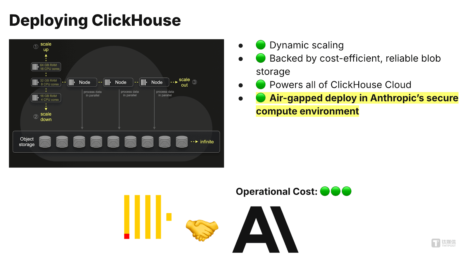 对于Anthropic而言,有三点核心诉求:一是实时采集海量数据,对半结构化数据进行快速、多维度分析;二是部署安全;三是可扩展性,能与市面上的可观测性工具实现良好兼容。但ClickHouse的开源版本并不能完全满足其上述需求,为此Anthropic选择在内部部署了隔离的ClickHouse Cloud云产品。从控制平台到数据平台,实现内部隔离。