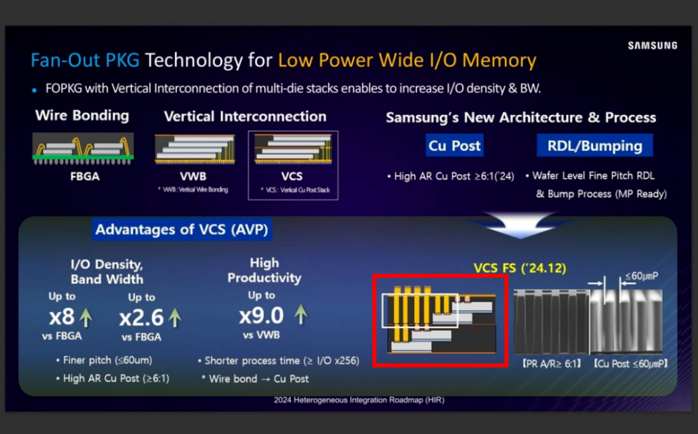 三星表示,VCS先进封装技术相较于传统引线键合,I/O密度和带宽分别提升8倍和2.6倍;相比VWB垂直引线键合,VCS技术生产效率提升9倍。
