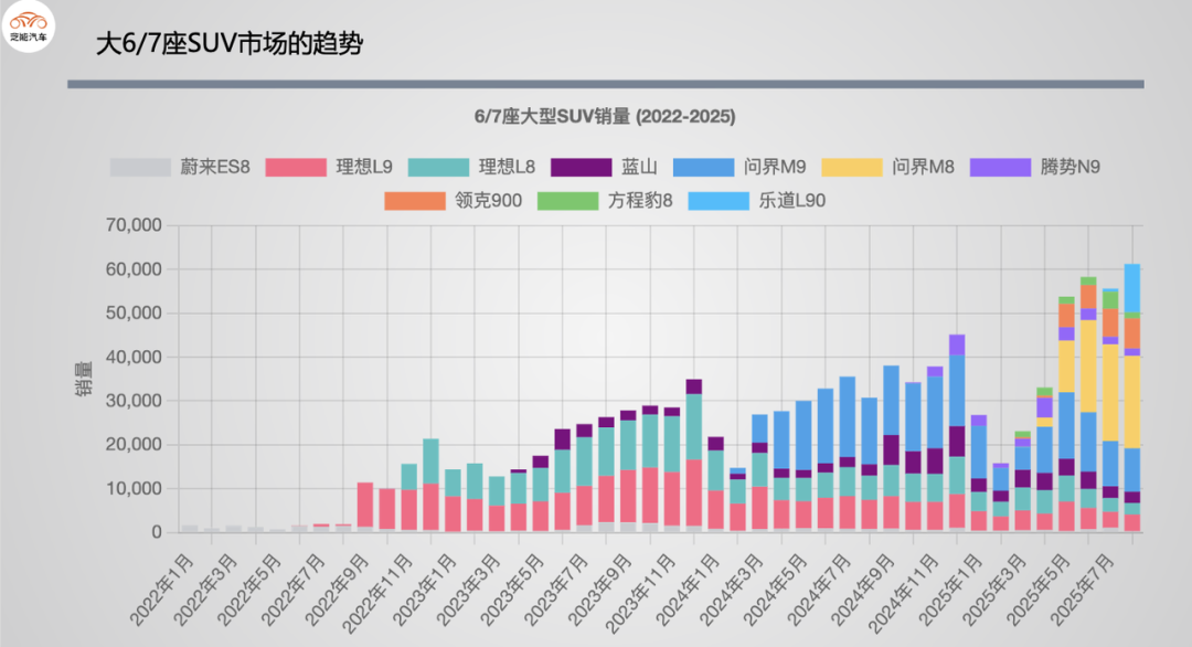 ◎ 1-8 月趋势分化显著:问界 M8的高峰是 7 月 22048 辆,乐道 L90 7 月首销 686 辆后,8 月爆增至 11066 辆;领克 900从 3 月 345 辆逐步升至 8 月 6861 辆,稳步向上。问界 M9(8月增程式8980台,纯电911台,大概是10:1的关系)、腾势 N9等在高位波动;理想 L8、理想 L9、蔚来 ES8呈波动下滑;昊铂 HL销量比较有限。
