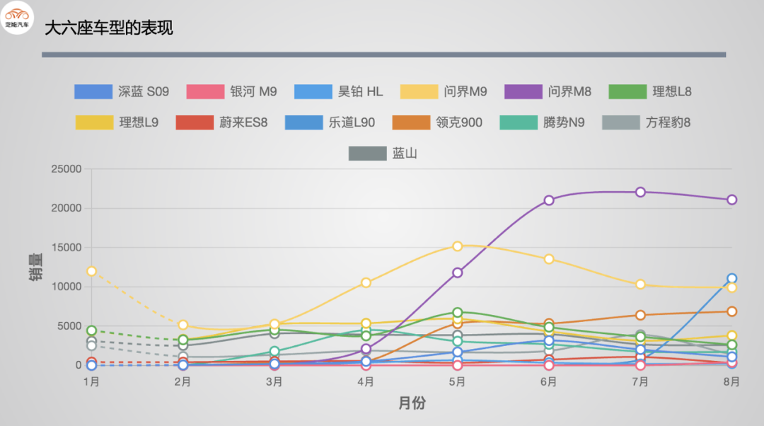 ◎ 8 月销量按高低排序为:问界 M8(21081 辆)、乐道 L90(11066 辆)、问界 M9(9891 辆)、领克 900(6861 辆)、理想 L9(3796 辆)、蓝山(2570 辆)、理想 L8(2623 辆)、腾势 N9(1700 辆)、方程豹 8(1378 辆)、深蓝 S09(1090 辆)、昊铂 HL(224 辆)、蔚来 ES8(301 辆)、银河 M9(389 辆,还没上市),理想的i8 8月的销量为2623台,预计接下来往更高的销量冲一冲,特斯拉Model YL在8月销量还没体现出来。