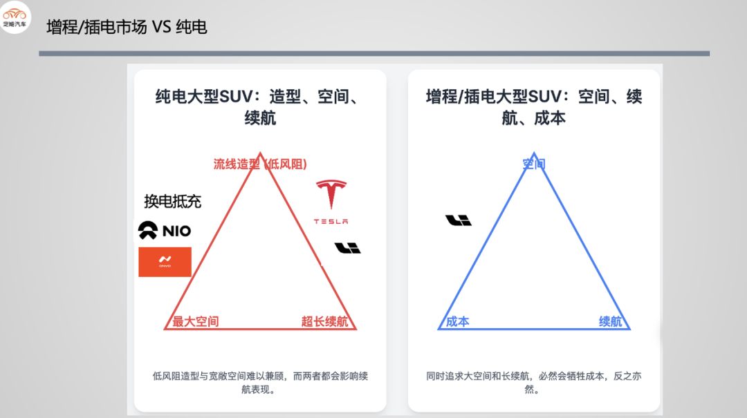 ◎ 纯电大三排SUV要解决的问题是造型、续航和续航的问题,蔚来是有补能体系,所以选择的是造型和空间,续航是配大容量电池+补能体系解决问题。理想和特斯拉,是围绕风阻造型上做妥协,来做空间和续航。