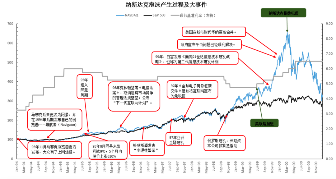 在这样的宏观经济驱动下,美国政府还有一连串的利好政策出台,比如1995年的降息政策、1996年的《电信法案》、1997年的《全球电子商务框架文件》等等(如图),也都让互联网在当时更受关注,估值也水涨船高。