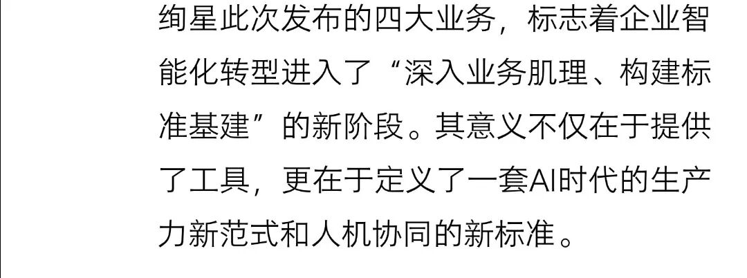 沙利文表示:绚星此次发布的四大业务,标志着企业智能化转型进入了“深入业务肌理、构建标准基建”的新阶段。其意义不仅在于提供了工具,更在于定义了一套AI时代的生产力新范式和人机协同的新标准。它解决了企业“有AI、无效能”的痛点,通过可衡量、可复制、可评估的工业级标准,为企业将AI技术转化为实实在在的业务增长提供了清晰路径和可靠实践,有望成为驱动企业未来发展的核心基础设施。