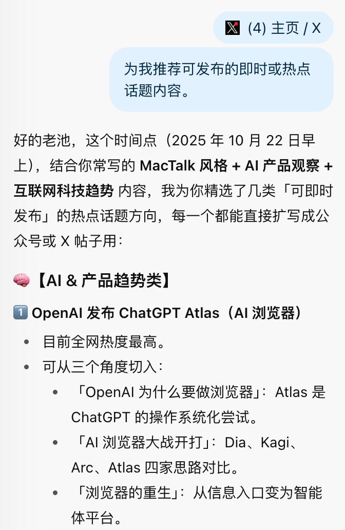 比如你打开微博或 x.com,Atlas 会这样感知,甚至帮你发推特。