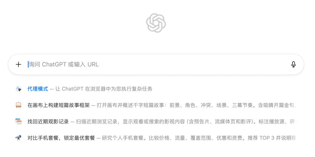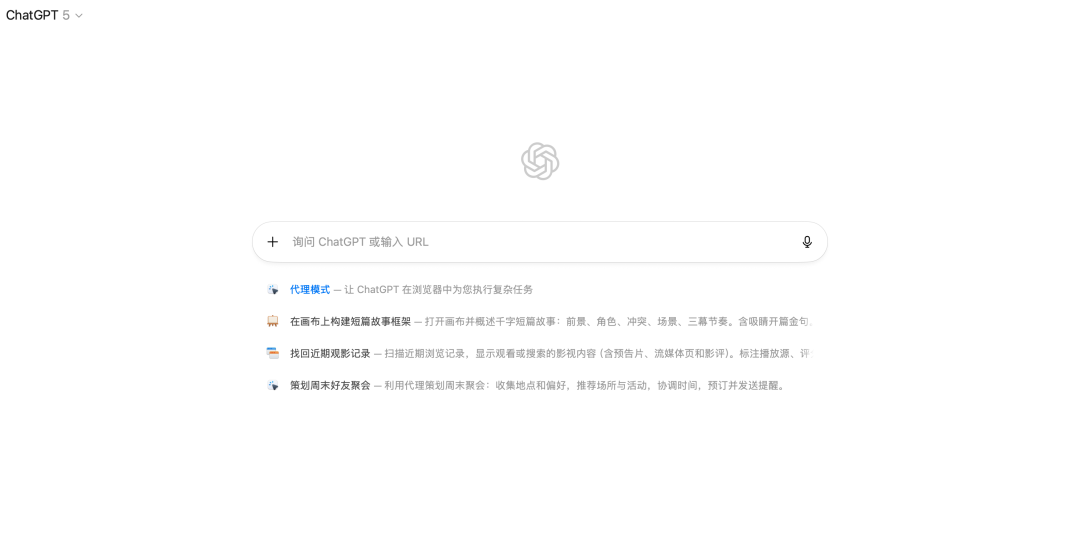 Atlas 支持全部 ChatGPT 功能,还可以基于浏览器的数据做上下文帮助你处理浏览器上的一切事务。首页如下: