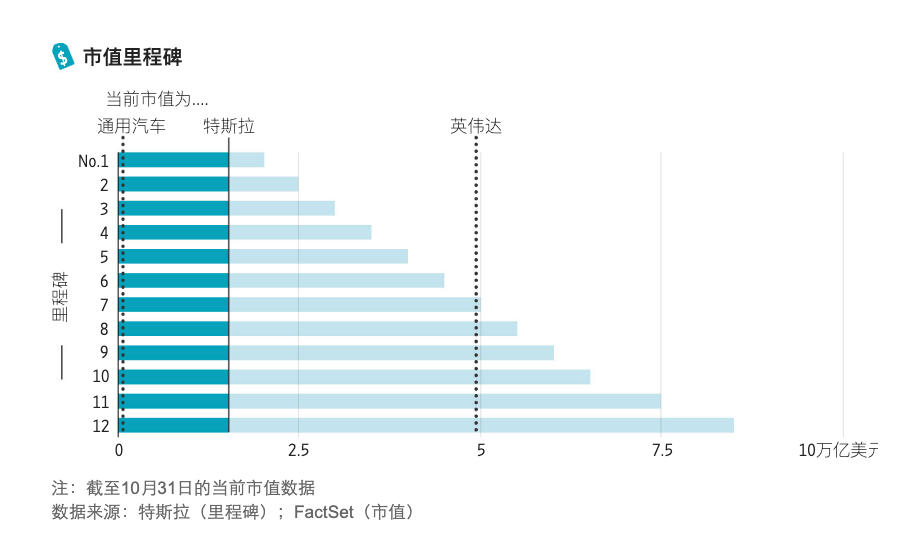 这些市值目标从2万亿美元起步,最高达8.5万亿美元。特斯拉目前的市值约为1.5万亿美元。新目标中有半数意味着特斯拉的市值达到或超过5万亿美元——这大约是芯片制造商英伟达(Nvidia)目前的市值,英伟达是目前全球市值最高的公司。
