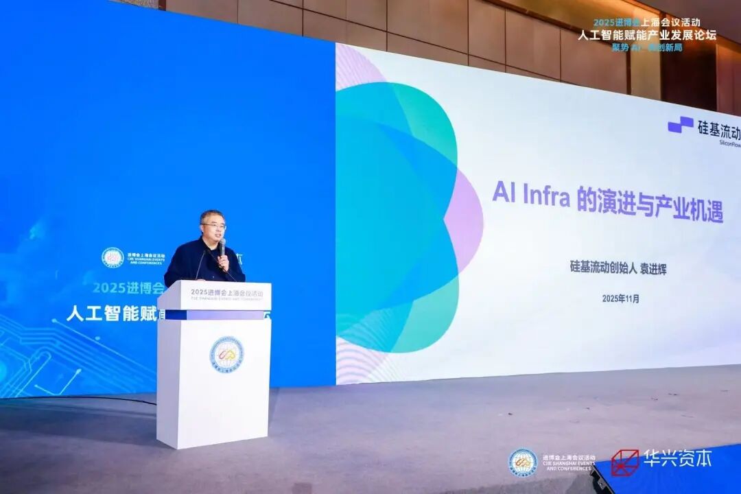 随后,硅基流动CEO袁进辉发表《AI Infra的演进与产业机遇》主题演讲。他指出,AI基础设施正成为连接算力、模型与应用的关键枢纽。硅基流动通过开放平台与标准化接口,降低模型与应用落地门槛,推动国产芯片、模型、应用间的高效协同。