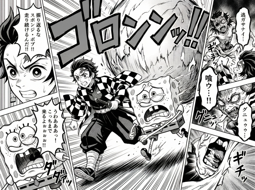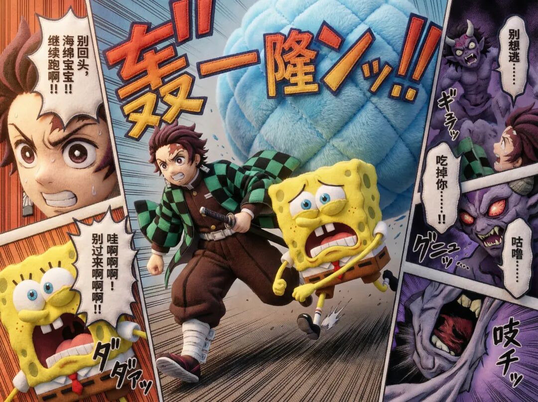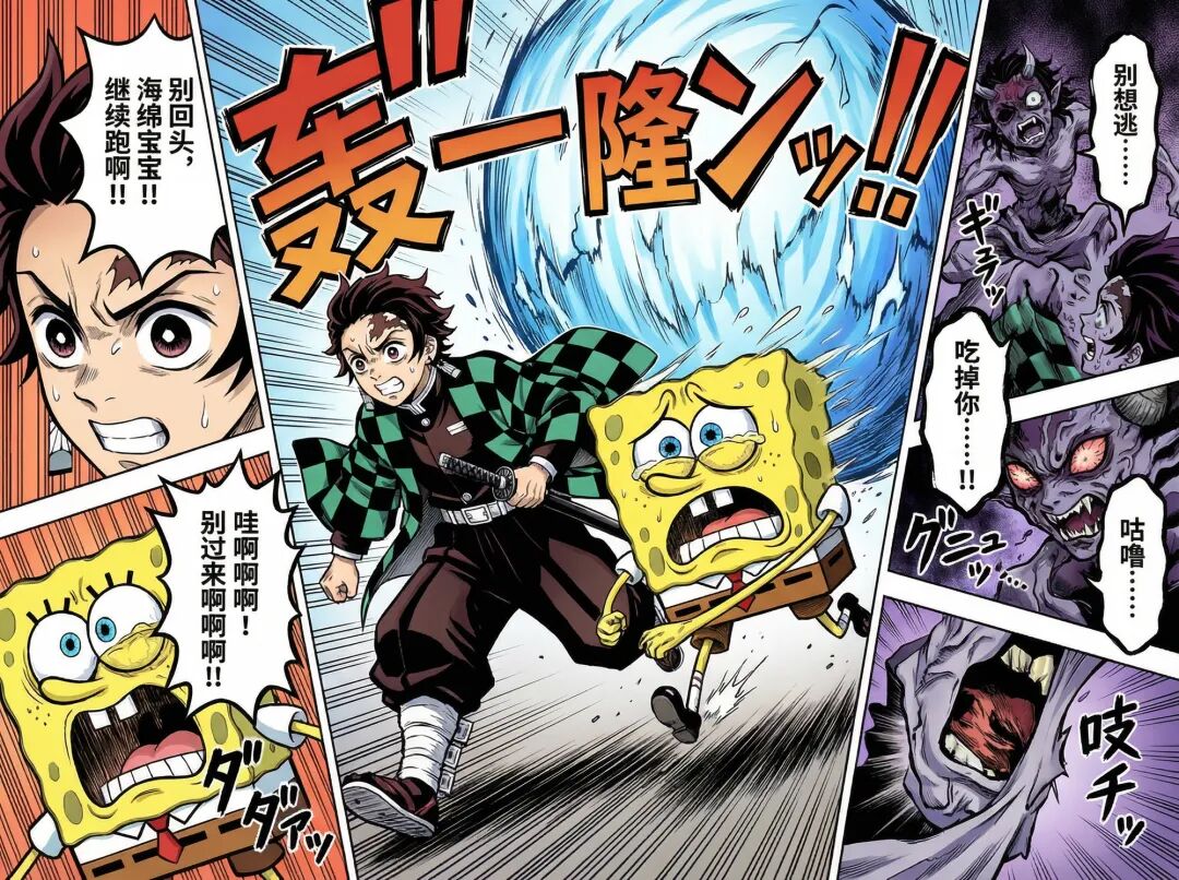 比如我又生成了一个中文的炭治郎和海绵宝宝一起玩的日文漫画。