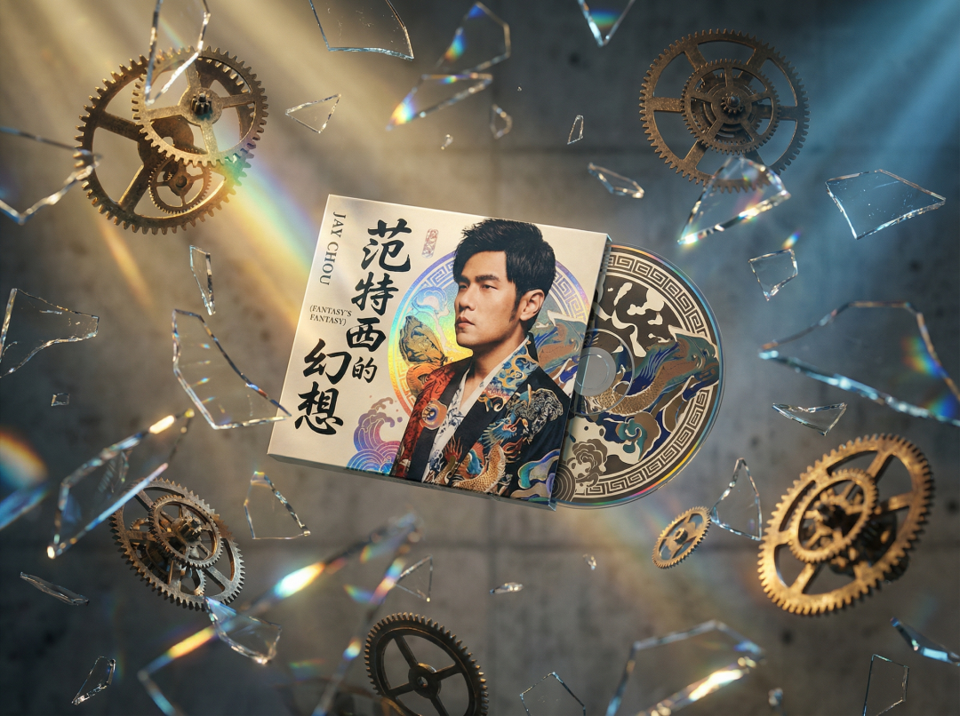 CD悬浮在半空中,周围是破碎的玻璃碎片和漂浮的时钟齿轮,呼应“幻想”与“时空穿越”的概念,电影级布光。