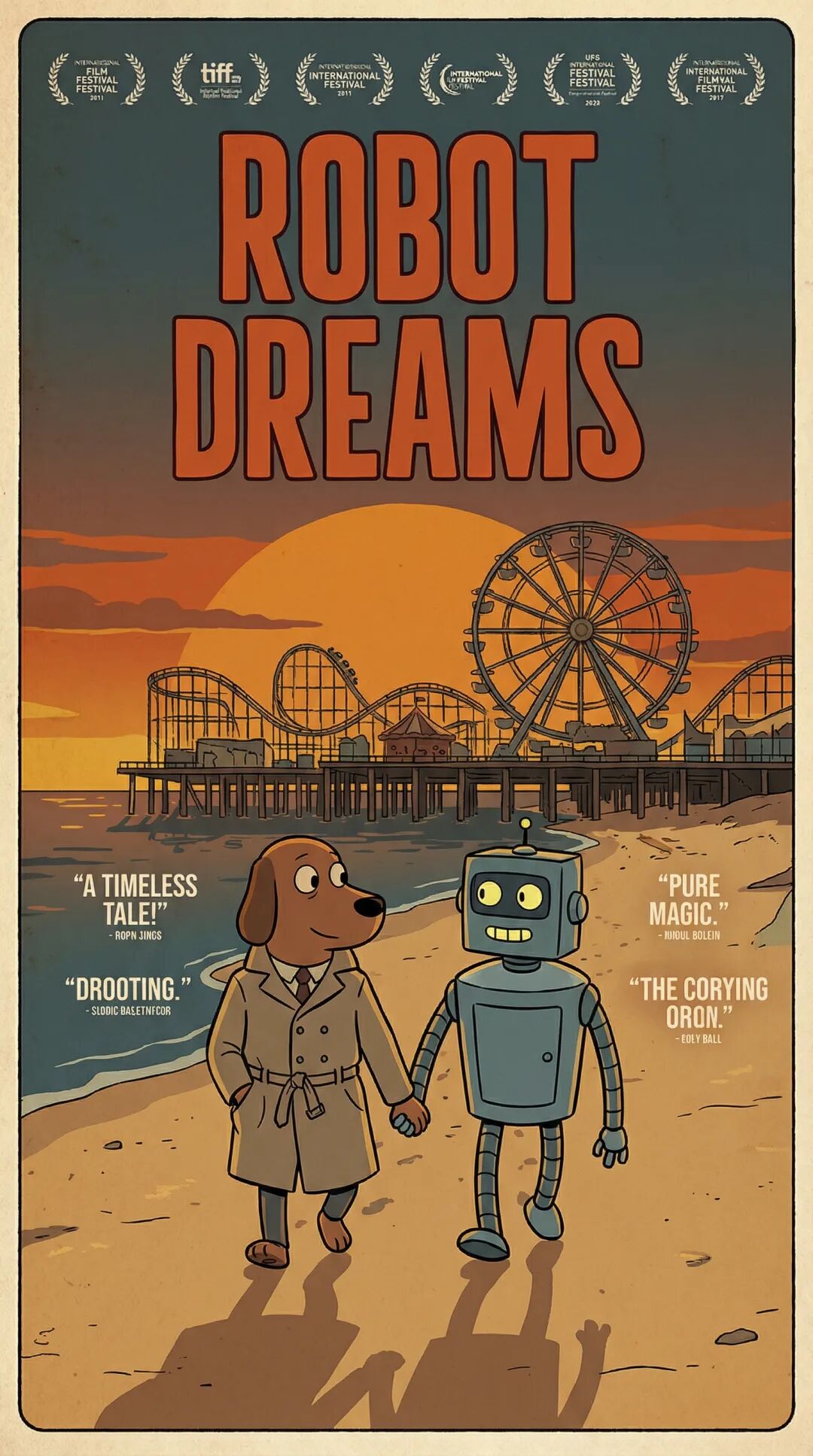 提示词:A retro movie poster for the film 'Robot Dreams', flat illustration, mid-century animation style, bold outlines, warm retro color palette. Scene: Anthropomorphic dog and boxy blue-grey robot walking hand-in-hand on a sandy beach at sunset, facing a dilapidated amusement park pier with a large ferris wheel and roller coaster. The sky is deep orange. Prominent typography with the huge bold title "ROBOT DREAMS" in deep orange at the top center. Small festival logos at the top edge, and small white review quotes placed around the characters. Nostalgic, melancholic mood.