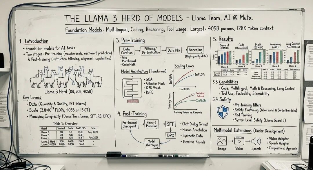 还把Llama 3 模型的92页PDF,也转了一道。