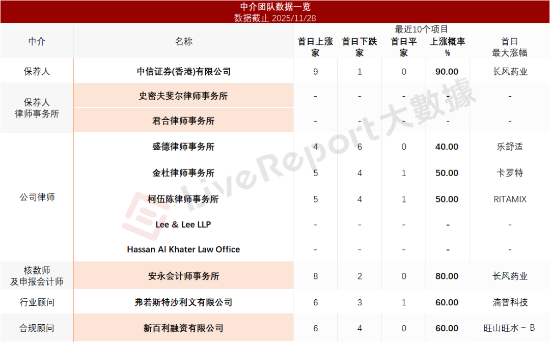 据LiveReport大数据统计,驭势科技中介团队共计11家,其中保荐人1家,近10家保荐项目数据表现良好;公司律师共计5家,综合项目数据表现平平。整体而言中介团队历史数据表现一般。