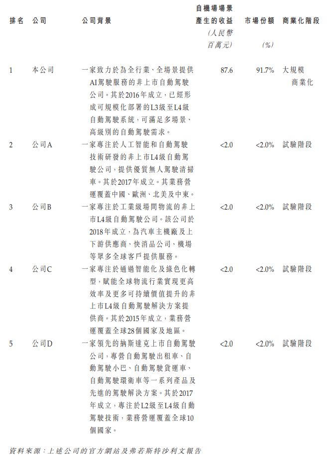 公司是大中华区首家于机场场景中实现L4级自动驾驶商用车大规模商业部署的公司,于2024年在大中华区商用车L4级自动驾驶解决方案的所有解决方案供应商中位列榜首,市场份额为91.7%。