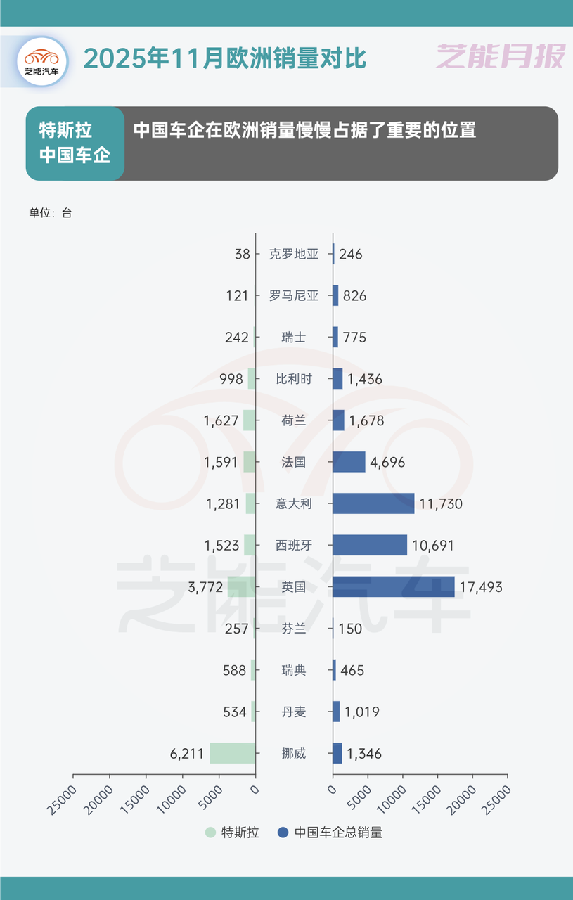 中国品牌销量加总,英国、中国车企整体达到17493辆,西班牙达到10691辆,意大利更是11730辆。