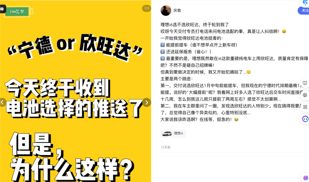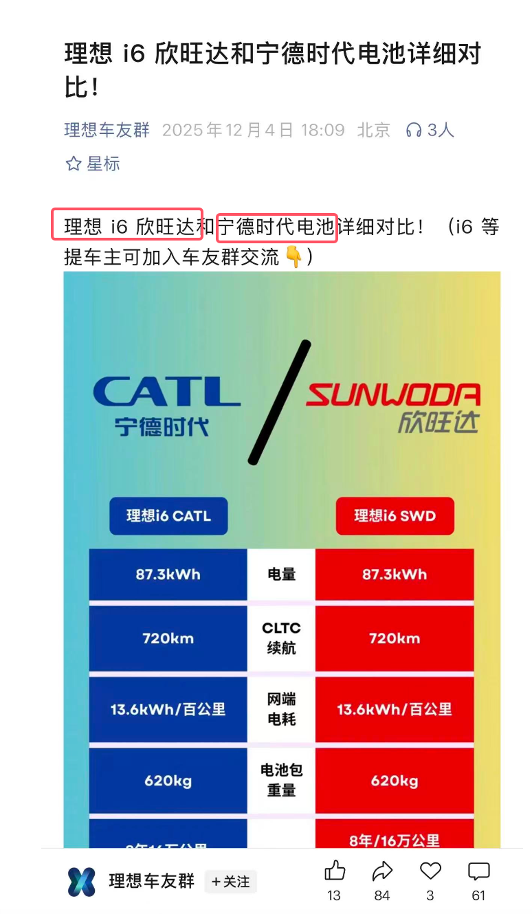 4 、理想车友群公众号和公众媒体报道显示,理想汽车 2026 年的新车还是选择欣旺达,在被起诉之后,这个恐怕给新的理想选手们带来负面加分。