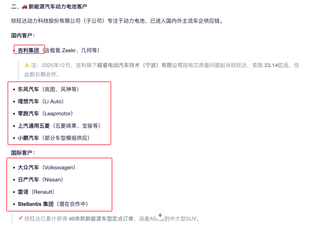 2 、欣旺达2025 年 7 月申请港股 IPO,看了一下说明书,公司在介绍重要客户的时候已经没有吉利,表述是这样的:我們已成為領先的汽車OEM的重要動力類電池商,包栝理想、小鵬、零跑、廣汽、上汽、雷諾及日產等。现在爆出这样的重大诉讼,对于港股 IPO 的节奏可能被打乱。