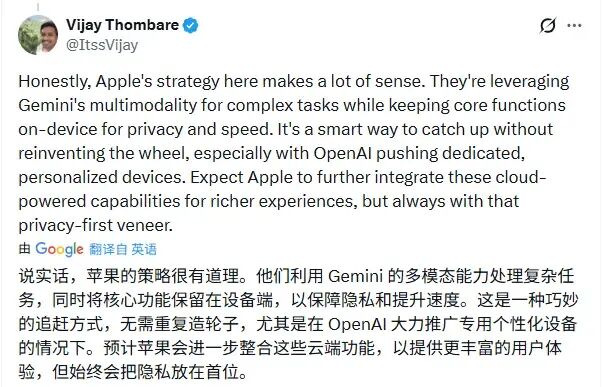 AI创业公司Hyperbolic CEO金雨辰评论道:苹果在Siri的路线上,长期在“云端能力”与“隐私优先”之间摇摆不定。最终,他们不得不倒向在多模态上更具优势的Gemini。更深层的原因是,当OpenAI开始染指硬件时,它就不再是一个安全的盟友了。