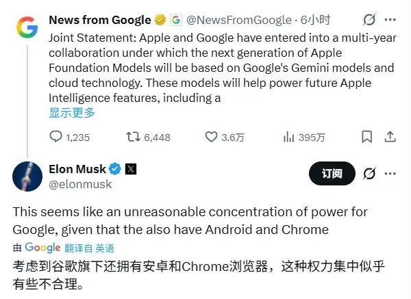 作为竞品Grok的老板,他的立场或许不纯,但他指出的问题真实存在:当一家公司同时掌控主流操作系统、浏览器和两大阵营的AI底层时,权力的边界究竟在哪里?