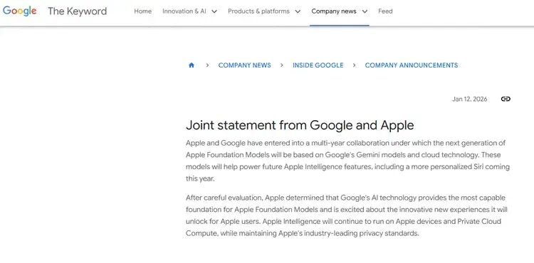 根据最新披露的信息,苹果与谷歌达成一项多年期、非排他性的合作协议。下一代“苹果基础模型”将基于谷歌的Gemini人工智能模型及其云计算服务构建。这些模型将主要用于驱动今年即将全面升级的Siri语音助手,并为其他“Apple Intelligence”功能提供支持。