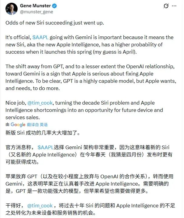 深水资产管理公司吉恩·蒙斯特(Gene Munster)评论称:新版Siri成功的几率大大增加了。苹果放弃GPT转而使用Gemini,表明他们正在认真改进Apple Intelligence,而不是在玩票。