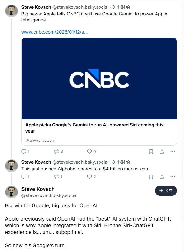 最尴尬的莫过于OpenAI。此前,ChatGPT已被整合进Siri作为“外挂大脑”。如今,谷歌直接上位成了“主脑”,OpenAI的角色瞬间变得可有可无。路透社援引分析师观点称,这直接“将OpenAI推入了次要的支持角色”。
