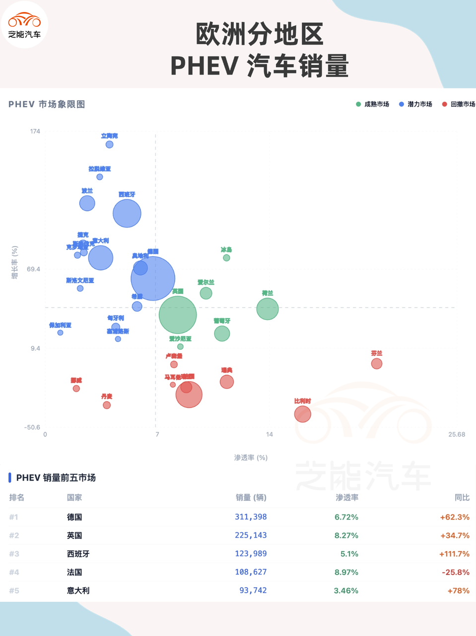 PHEV 全年在欧洲合计销量约 127 万辆,同比增长 33.4%,高度集中在少数大市场:德国(31.1 万辆)、英国(22.5 万辆)、西班牙(12.4 万辆)、法国(10.9 万辆)和意大利(9.4 万辆),其余多数国家仍停留在数千到数万辆规模,卖不动。