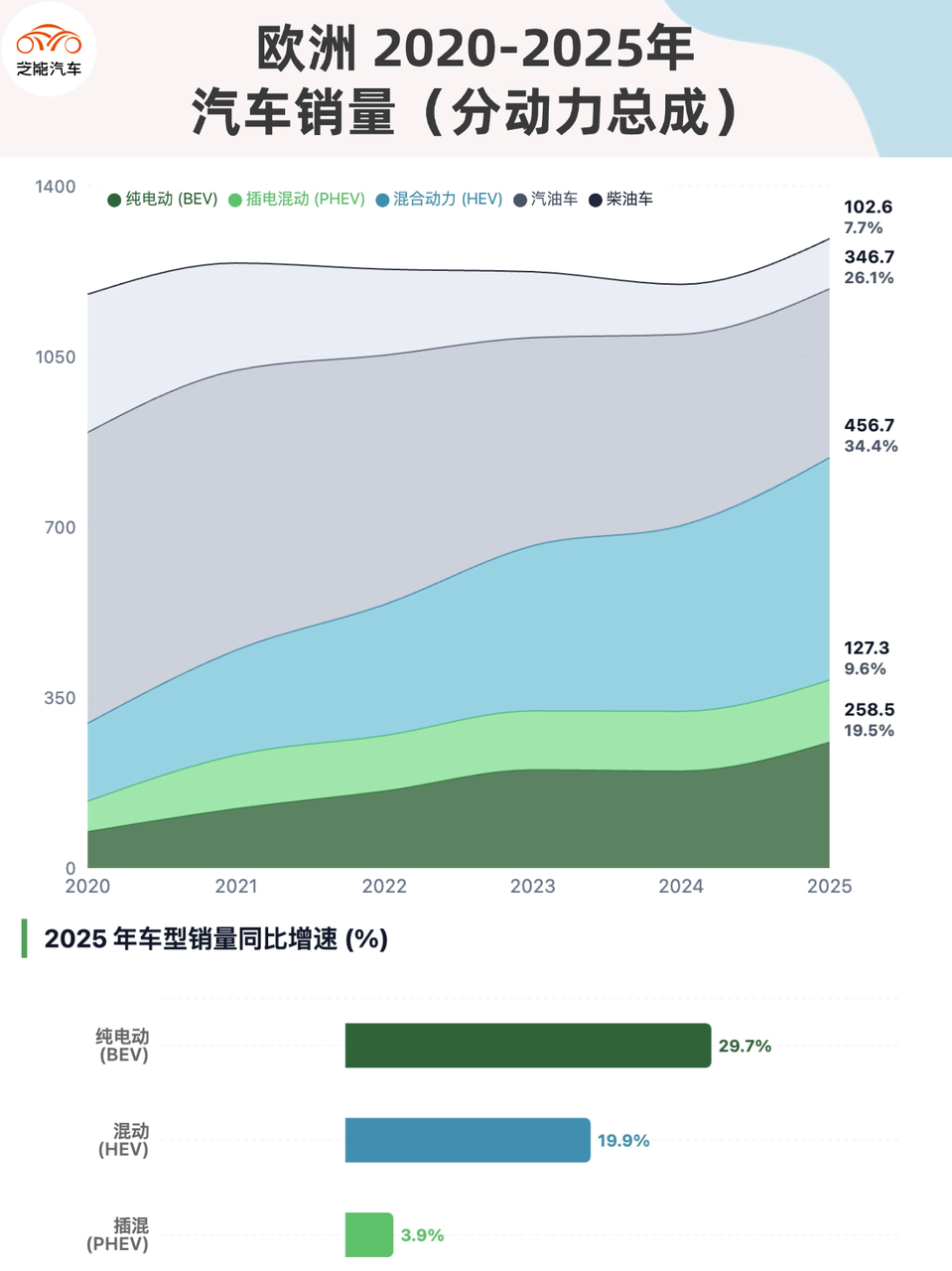 欧洲从2020-2025年整个新车销量基本稳定,2025年销量1327 万辆,同比 +2.4%,在这几年里面,电动化(纯电动、HEV)发展挺快的。
