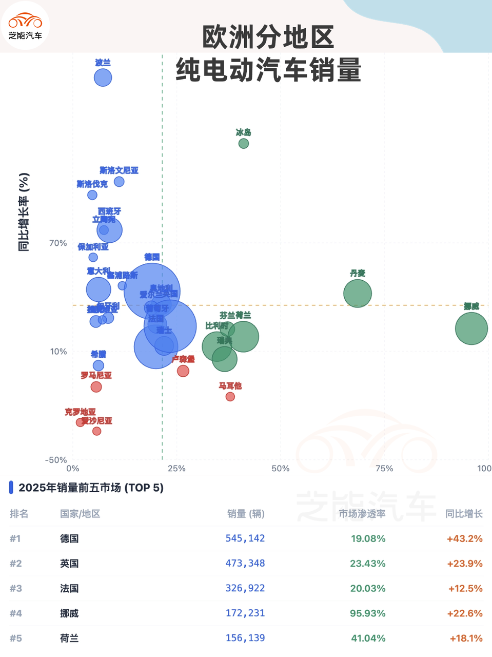 ◎ 相比之下,意大利、西班牙、波兰、捷克、罗马尼亚等国家渗透率仍在 5%–10% 左右。