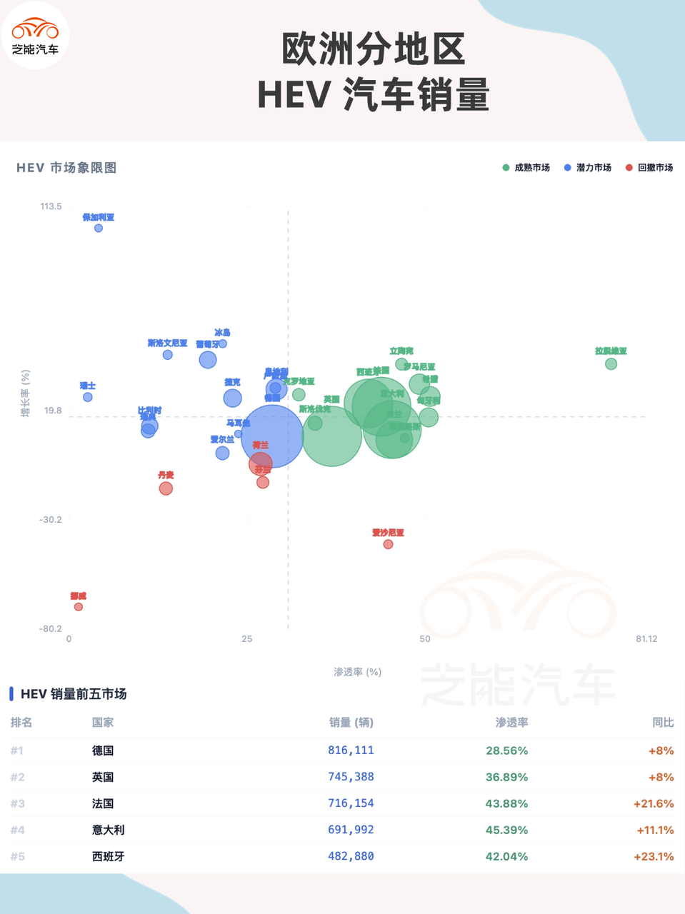 德国(81.6 万辆)、法国(71.6 万辆)、英国(74.5 万辆)、意大利(69.2 万辆)、西班牙(48.3 万辆)、波兰(27.3 万辆)等国家构成 HEV 的“基本盘”。