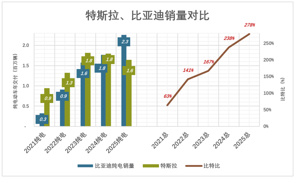 2025年,特斯拉失去纯电动车(狭义新能源车)全球销量的第一桂冠。比亚迪纯电动车销量达226万辆、比特斯拉高37.9%。如果算上插电混动车型销量,比亚迪新能源车(广义)总销量是特斯拉的278%,连续第四年领跑。
