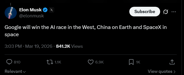 Google will win the AI race in the West, China on Earth and SpaceX in space.