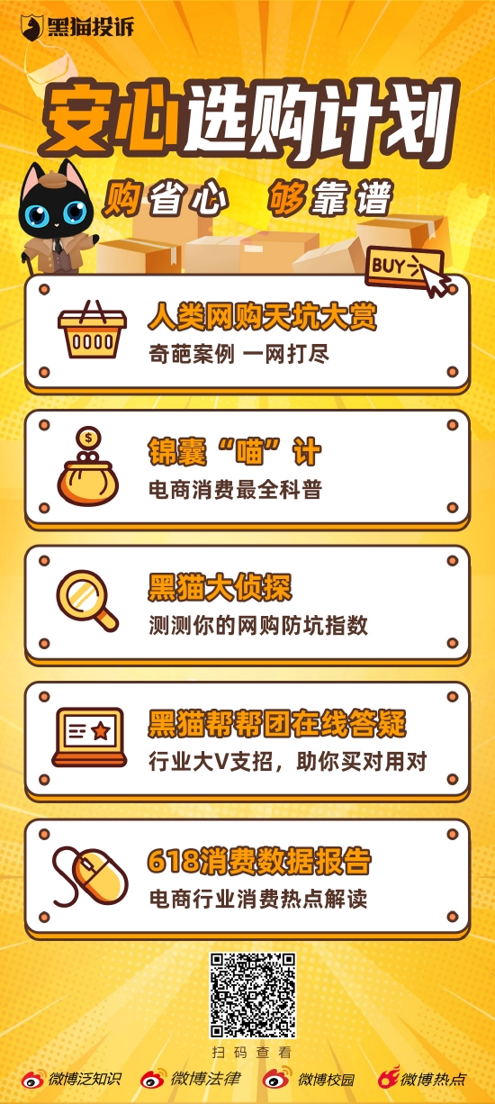 黑猫投诉【投诉入口】作为新浪旗下消费者服务平台,在2022年618消费活动到来之际,联合微博泛知识、微博法律、微博校园、微博热点等不同领域,以“安心选购计划”为主题,通过征集重点消费问题、购物知识科普、避坑互动小游戏、邀请消费领域大咖连麦、发布消费报告等活动,帮助消费者辨别各类网上消费陷阱,科普安全购物知识,防患于未然,全方位地维护消费者合法权益。