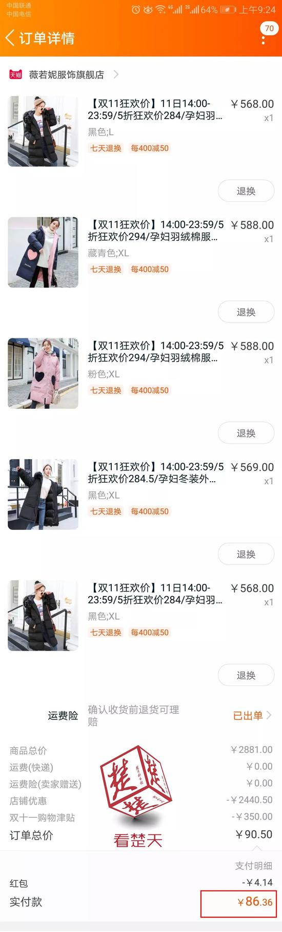 王先生挑选了5件棉服,折前总价2881元。经过优惠券扣减、双11购物津贴、红包等多重优惠打折后,王先生实际支付了86.36元。