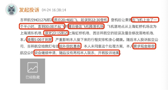 近日,有消费者通过黑猫投诉【投诉入口】平台反馈,吉祥航空航班登机延误近两小时,登机后在飞机上又坐了一个半小时才起飞,起飞后又擅自更改降落机场,造成自己凌晨5:00才到家,影响接下来的行程安排和身心健康。被投诉后航司表示仅补偿优惠券,对于消费者提出的现金补偿要求表示会继续申请,然而随后再没有联系,并将投诉结案。