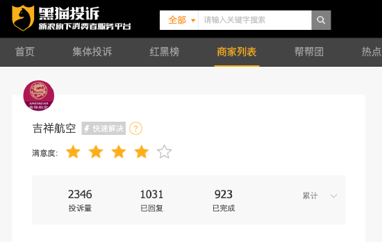 截至目前,吉祥航空在黑猫投诉平台投诉累计达2346单,回复率不足45%。