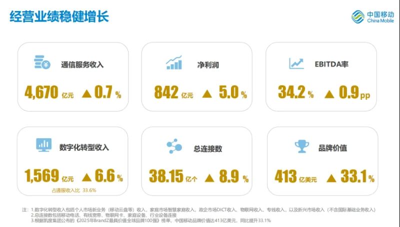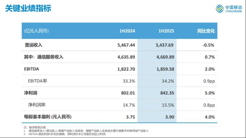 8月7日,中国移动公布2025年中期业绩:营运收入达5438亿元,其中通信服务收入为4670亿元,同比增长0.7%。总连接数达到38.15亿,净增1.45亿。CHBN中,HBN收入占通信服务收入比达到47.6%,同比提升2.6个百分点。数字化转型收入达到人民币1569亿元,同比增长6.6%,占通信服务收入比达到33.6%,同比提升1.9个百分点。EBITDA近1860亿元,同比增长2.0%,EBITDA占通信服务收入比为39.8%,同比提升0.5个百分点,净利润达到842亿元,同比增长5.0%,盈利能力继续保持国际一流运营商领先水平。
