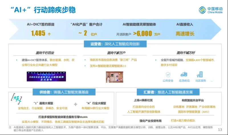 “AI+”核心能力加速锻造,打造多模型和智能体聚合服务引擎MoMA,“九天”通专大模型矩阵全新升级,布局超50款行业大模型。“AI+”生态汇聚深入推进,人工智能“焕新社区”正式发布,聚合央企和产业链力量共同打造国家级AI开源开放创新平台。“AI+”应用创新百花齐放,AI+规模效应初步显现。灵犀智能体月活跃客户超6000万户。AI直接收入实现高速增长。