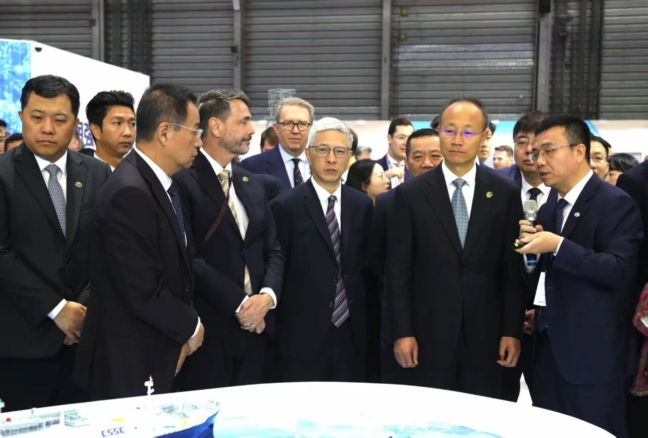 中国国际海事会展被誉为全球海事业的“风向标”,也是全球最具影响力和规模最大的海事专业会展。本次会展,中船集团展台面积达4000平方米,以“向海图强 智领深蓝”为主题,聚焦“高端、绿色、智能、深海、极地、生态”主线,分设高端产品、绿色能源、智能技术、深海开发、极地探索、生态融合等六大展区,集中展示中船集团品牌形象,呈现高端产品、卓越技术和生态服务。其中,“梦想”号大洋钻探船、国产大型邮轮“爱达·花城号”、27.1万立方米LNG船、核动力集装箱船等旗舰产品,32.5万吨甲醇双燃料矿砂船等绿色船型以及WinGD10X92DF-M-1.0甲醇双燃料主机、BrilliancE B型燃料舱、船舶碳捕集装置等低碳零碳转型重要装备,“珠海云”号智能无人科考母船、“未来”号深远海绿色智能技术试验船等智能船舶平台,“奋斗者”号等系列载人潜水器、“深海一号”等尖端探索装备、深水钻井平台等深海开发装备以及15万吨智慧渔业养殖工船等深海装备,“雪龙2”号极地科考破冰船、“极地”号破冰调查船等极地装备等一系列代表中船集团最高水平和最先进研发能力的产品装备和技术纷纷亮相,聚焦现代海事服务体系建设的生态融合区集中展示中船集团在供应链、贸易、服务等领域的开放合作竞争优势。