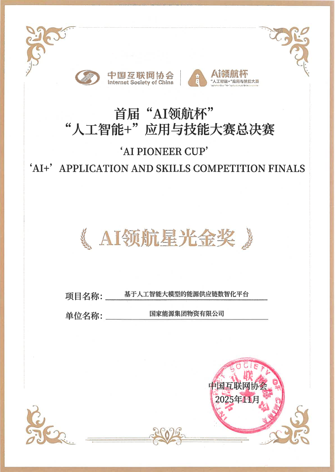 12月3日,2025“人工智能+”产业生态大会暨首届“AI领航杯”“人工智能+”应用与技能大赛在北京圆满落幕。本届比赛吸引超2000支团队在AI+能源、AI+交通等20个专题赛道展开角逐,由物资公司申报的“基于人工智能大模型的能源供应链数智化平台”项目表现卓越,荣获“AI+能源”赛道一等奖,并成功斩获该赛事全国总决赛最高荣誉——AI领航星光金奖。