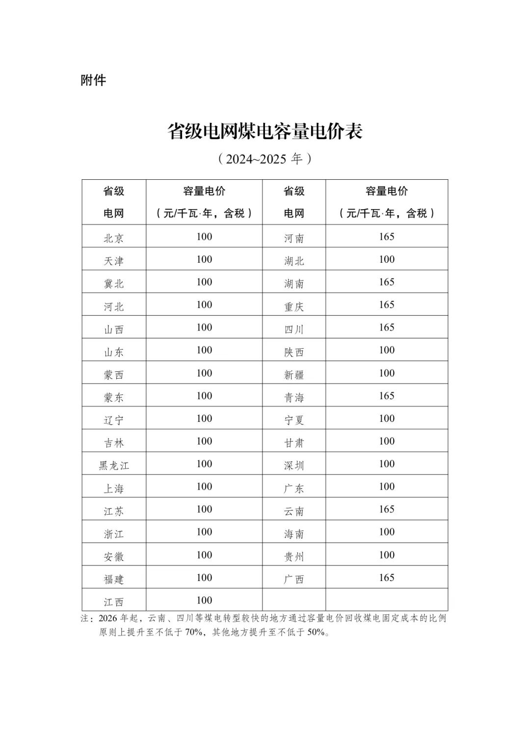 其中,用于计算容量电价的煤电机组固定成本实行全国统一标准,为每年每千瓦330元;通过容量电价回收的固定成本比例,综合考虑各地电力系统需要、煤电功能转型情况等因素确定,2024~2025年多数地方为30%左右,部分煤电功能转型较快的地方适当高一些,为50%左右(各省级电网煤电容量电价水平具体见附件)。