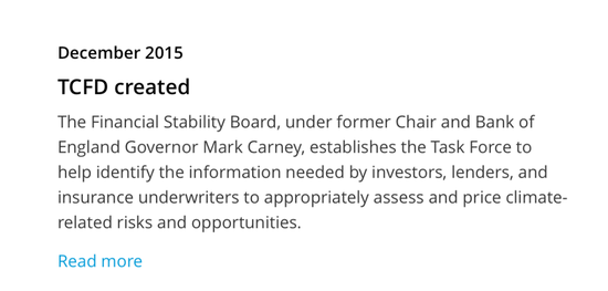 对ESG业内人士来说,卡尼的名字并不陌生,因为TCFD和GFANZ和他都有密切关系。2015年,卡尼仍是英国央行行长,也是G20金融稳定理事会(FSB)主席,他提出气候变化可能会导致系统性金融风险,主张央行要积极应对气候变化。正是因为FSB的支持,气候相关的财务信息披露工作组(TCFD)才得以成立。TCFD的网站上仍记录着2015年这一重要时刻(下图)。