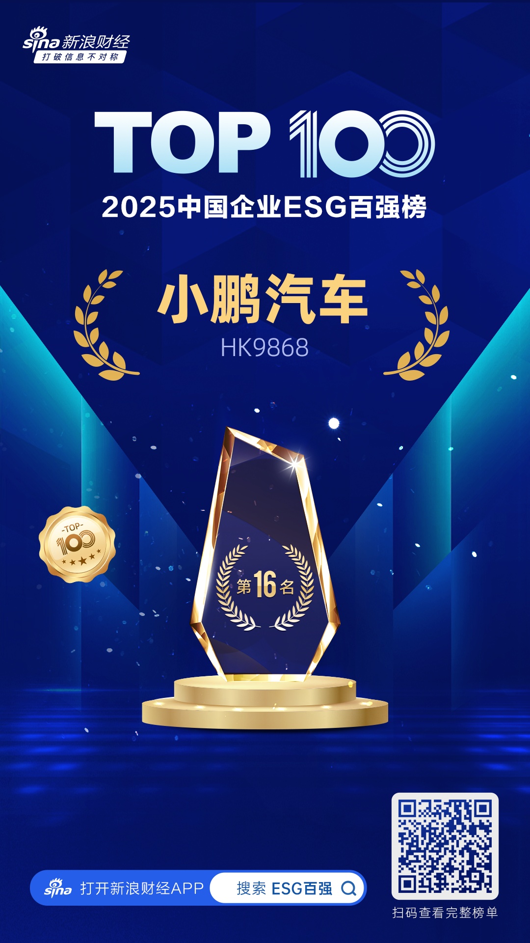 小鹏汽车在环境、社会、公司治理领域开展了大量工作,积累了丰富的创新实践与扎实的落地成果。凭借在ESG各领域的卓越表现,小鹏汽车成功入选本次新浪财经“2025中国企业ESG百强”榜单,并位列第16名。